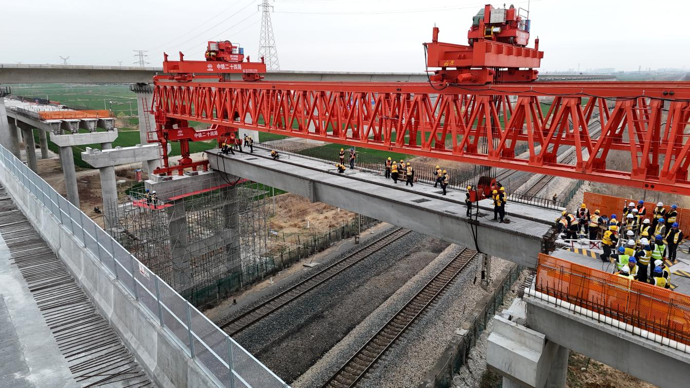 項目位于蚌埠市固鎮縣,全長1.988千米,由中鐵二十四局負責項目實施。京滬鐵路每日通行約140對列車,為確保鐵路運營不受干擾,單日封鎖施工時間有限,需要在100分鐘內完成兩片高2米、長40米、重170噸的箱梁架設任務,施工難度高、安全風險大。