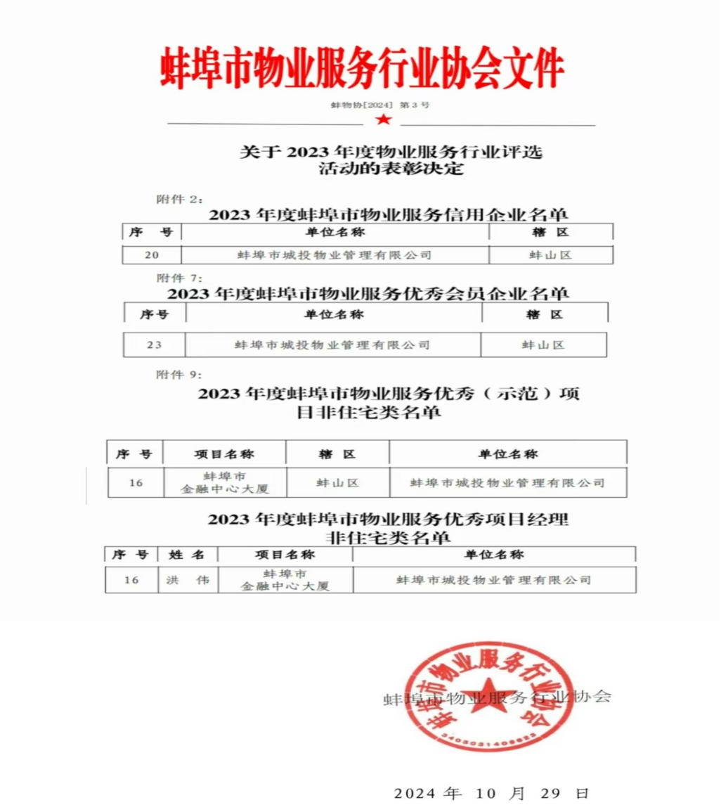 10月29日,城投物業公司在 2023 年度物業服務行業評選表彰活動中喜獲2023年度蚌埠市物業服務信用企業、2023年度蚌埠市物業服務優秀會員企業、2023年度蚌埠市物業服務優秀(示范)項目非住宅類、2023年度蚌埠市物業服務優秀項目經理非住宅類等四項榮譽稱號。 城投物業公司在城...